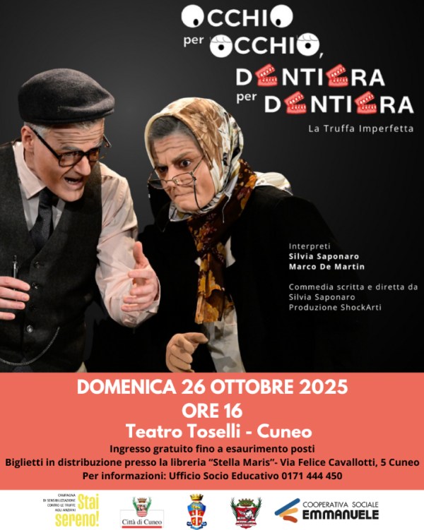 Domenica 26 ottobre, alle ore 16, il Teatro Toselli di Cuneo ospiterà la commedia “Occhio per occhio, dentiera per dentiera – La truffa imperfetta”, scritta, diretta e interpretata da Silvia Saponaro insieme a Marco De Martin, per la produzione ShockArti.